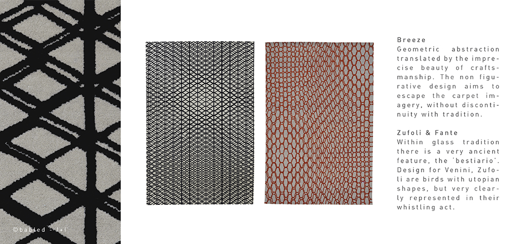 At the end of 2006 I became designer assistant of Emmanuel Babled while continuing my studies. Owing to this role, I improved my design, presentation and development skills, paying peculiar attention to the origin of the product itself and its impact on the local working sector. Thanks to Babled Studio, he had the opportunity to collaborate with many companies and design galleries; among them Venini, Vistosi, De Vecchi, I+I, Kundalini, TorArt, Metea, Gedy, ecc…, Nilufar, The Apartment gallery, Kessler, ecc.. .