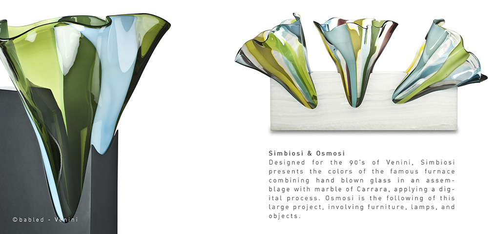 I also attended many seminars and displays about the Murano glassblowing design and involved with different materials tested: first of all Murano glass, ceramic, plastic (rotmoulding and injection), plexiglas, marble, fabrics, silver.