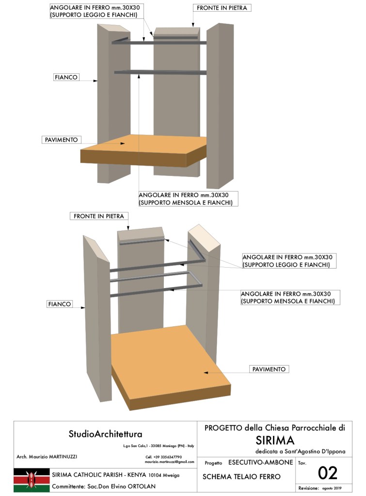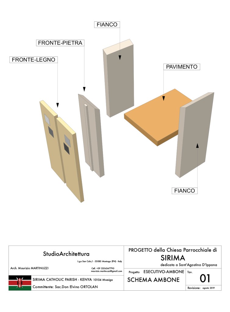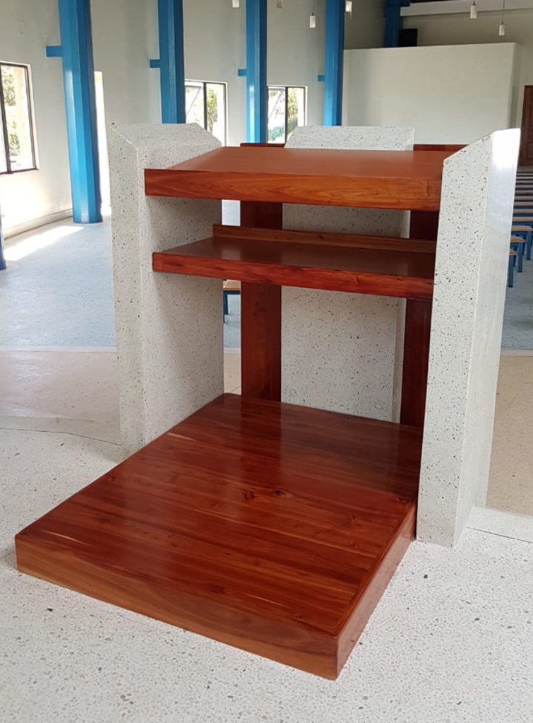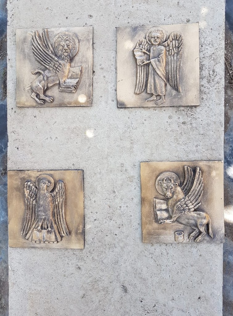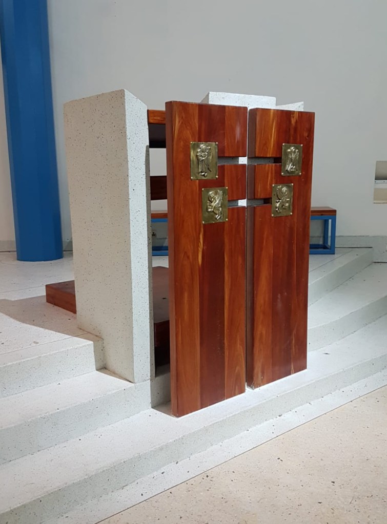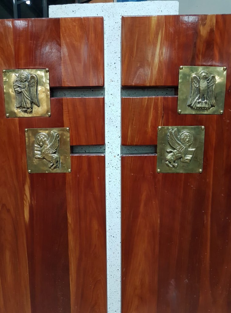 Il luogo della Parola quindi è molto ampio, non solo per la normale accessibilità del celebrante o dei concelebranti ma anche per la presenza dei laici abituati ad uno spazio “dedicato”; l’ambone è in legno e marmo con una una forma “rivolta” verso l’aula com’è consuetudine per questo segno Cristologico; dal punto di vista iconografico sono previste quattro formelle in bronzo indicanti i quattro Evangelisti: Matteo (uomo), Marco (leone), Luca (bue), Giovanni (aquila)